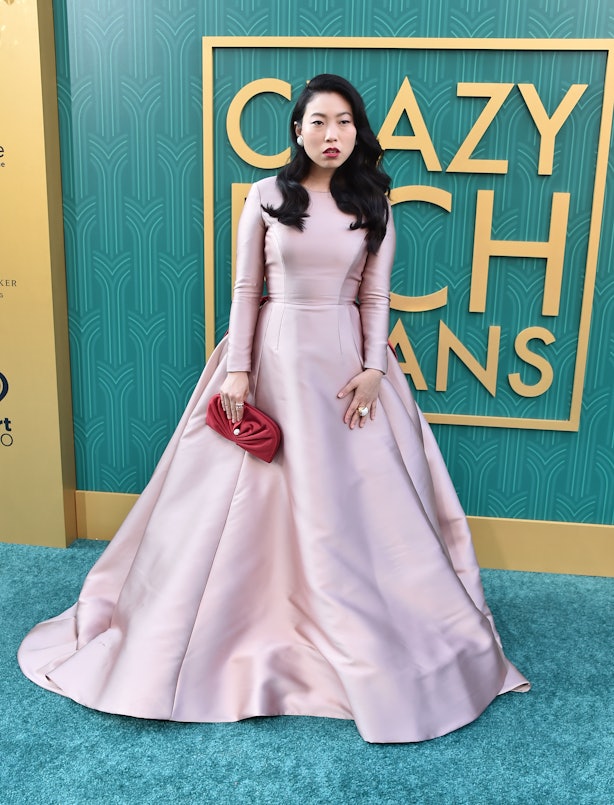 Awkwafina wore a Reem Acra silk long-sleeved gown dress and contrasted the blush pink with the red pleated clutch.