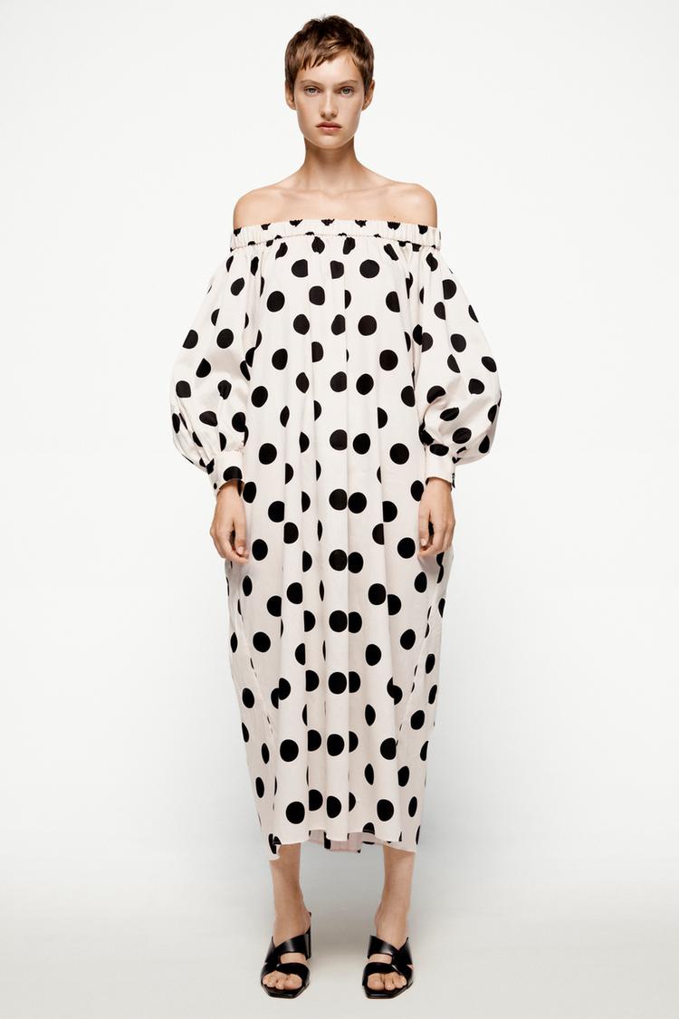 Let the blessings flow this summer season with a polka dot dress with off-the-shoulder and balloon sleeves. It’s a refreshing dress that’s unique and quite elegant.
